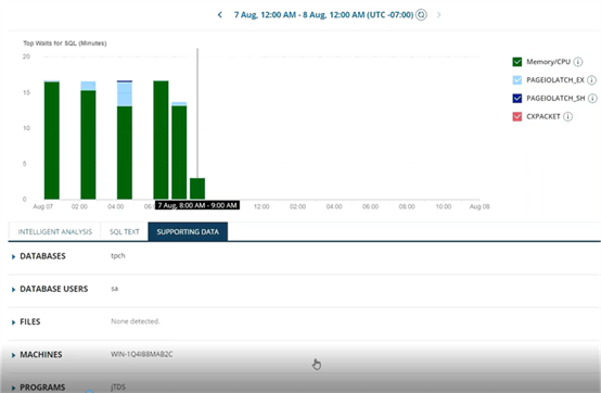 此外,在查询级别的性能指标和相关建议,使用“查询性能分析”,您还可以单击“ SQL文本”选项卡以查看与查询关联的T-SQL代码以及“支持数据”选项卡查看与查询计划相对应的数据库,用户,文件,计算机,程序等。