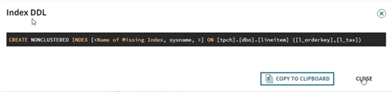 在索引建议的右侧,您可以单击“显示索引DDL”选项,这将弹出带有相应代码的以下屏幕。可以将代码复制到剪贴板以开始测试索引建议,以验证DPA的Projected Impact与您在测试环境中看到的改进相对应。