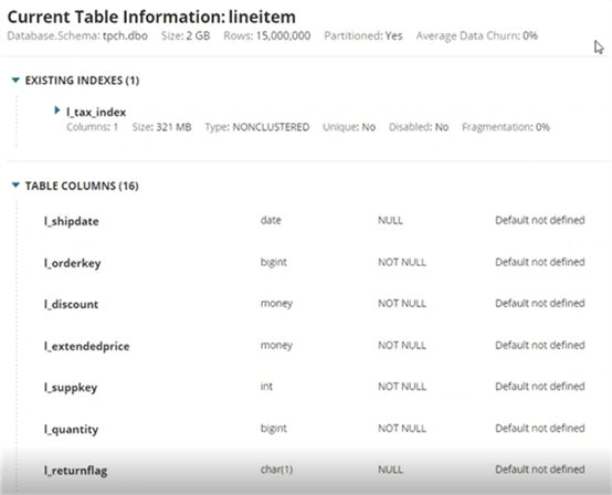 为了在表格基础上完成分析,在性能建议和理由下方是当前表格信息,包括常规元数据,平均数据流失(表格中插入,更新和删除事务的百分比),具有以下内容的现有索引和列它们的数据类型,空配置和默认值。在查看表时,此信息很有用,而不必使用其他工具。