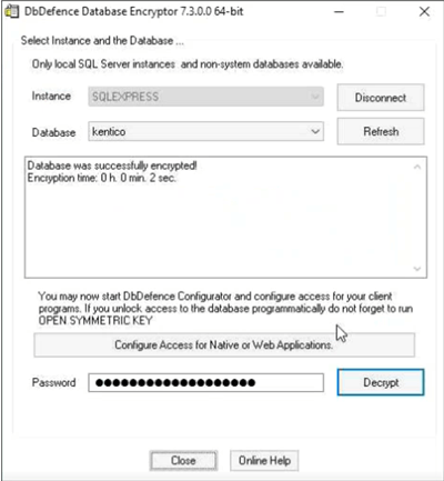 要开始加密过程,您只需安装DbDefence并连接到SQL Server数据库即可。身份验证后,您只需输入密码即可用作加密密钥,然后按加密按钮。根据数据库的大小,这可能需要几秒钟到一个小时。此加密级别将使用所有默认参数。