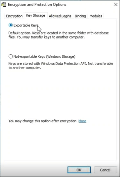 在DbDefence的“ 密钥存储”选项卡上,可以配置密钥是存储在文件系统中还是存储在受Windows Data Protection API保护的Windows内部文件中。此外,还有一个选项可以将密钥存储在PKCS#11兼容的硬件设备中。