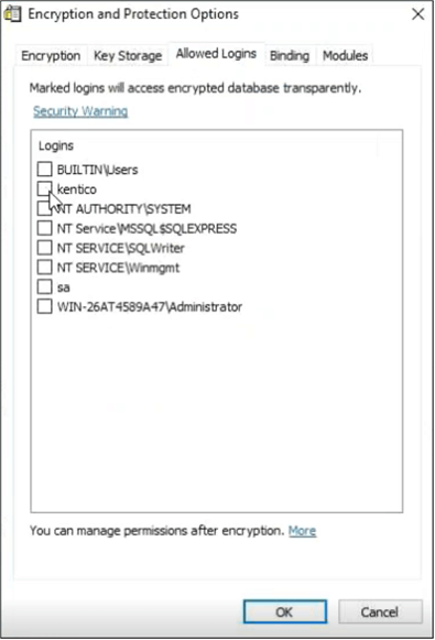 除了DbDefence的所有加密功能之外,该产品还具有通过登录名或应用程序限制对SQL Server数据库的访问的能力。下面是DbDefence的“允许登录”选项卡,您可以在其中限制对数据库的访问,以取代SQL Server登录名和服务器角色权限。这种类型的功能对于希望将数据库作为“黑匣子”进行交付以防止本地超级用户查看或修改数据库的软件供应商而言也很有价值。