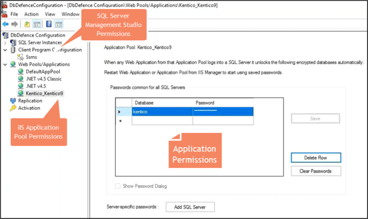 除了登录限制,您还可以使用 DbDefence配置工具在每个应用程序和每个IIS应用程序池级别上建立访问已解密数据和对象的权限。