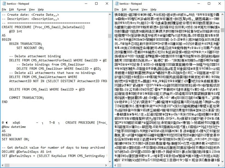 一个鲜为人知的事实是,可以使用文本编辑器轻松打开SQL Server数据库备份,并且可以以明文形式查看数据。 使用DbDefence消除了此漏洞,因为对SQL Server数据库备份进行了加密,不仅保护了联机数据,还保护了脱机数据。请参见下面的屏幕快照,其中打开了使用记事本打开的本机SQL Server备份和 DbDefence保护的备份。
