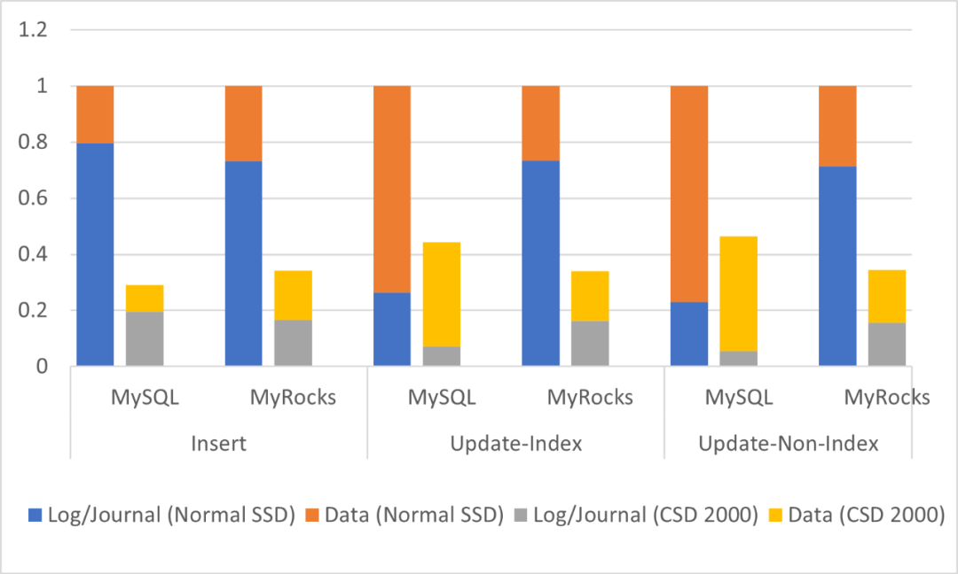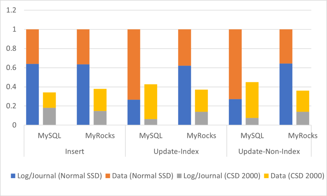 我们选用ScaleFlux的 CSD 2000(3.2TB)作为评估的目标SSD。CSD 2000是一款实现了透明压缩的SSD,其压缩能力和Gzip Level 6相当,压缩吞吐可达2GB/s以上【5】。同时,我们选用Sysbench 1.1.0作为基准测试,并使用insert,update-non-index和update index三种写入方式评估MySQL 5.7和MyRocks(MySQL 8.0 + RocksDB 6.9)的写放大,以及透明压缩在减少写放大上的效果。测试中使用的CPU为24核@2.3GHz E5-2630,内存为128GB,文件系统为Ext4,线程数为24。在测试时,Sysbench先向数据库中写入200GB数据,在此基础上依次进行insert、update-non-index和update index的操作,并记录每种情况下主机端的数据写入量以及NAND的实际写入数据量(在普通SSD下这两个数据写入量基本相等,而在透明压缩的环境下,NAND的实际写入量往往会小于主机端的写入量)。MySQL的测试中关闭软件压缩,页面大小为16KB,内存池为32GB;而MyRocks中RocksDB采用LZ4软件压缩,总共7个level,其它为默认配置。此外,在测试中每个事务均进行commit和sync操作,以保证数据的安全性和一致性。图7显示了188B的行大小下,MySQL和MyRocks在不同写入场景下的log/journal写入数据量和data的写入数据量(均以正常SSD中的写入量进行了归一化)。从图中可以看出,log/journal的写入量的占比是很可观的,尤其是在MyRocks中,基本都达到了70%以上。一般情况下,这些由log/journal写入的数据,是具有较好的压缩比的,特别是文件系统写入的日志,压缩比往往可以达到5:1甚至更高。因此,经过透明压缩后,写入的数据量会有明显的降低(测试中降低了50%以上)。