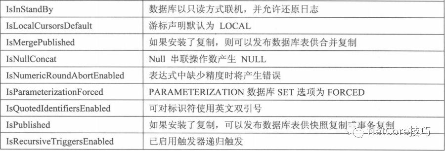 注:上述代码中DataBaseProperTyex语句中第一个参数表示要返回信息的数据库,第二个参数表示要返回数据库的属性表达式,其他的查看属性参数如下: