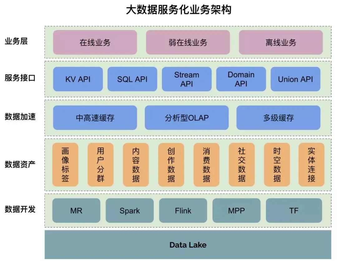 大数据服务化业务架构如下所示,Data Lake 数据湖中存储原始数据,经过数据开发之后,形成按主题域组织的数据资产。