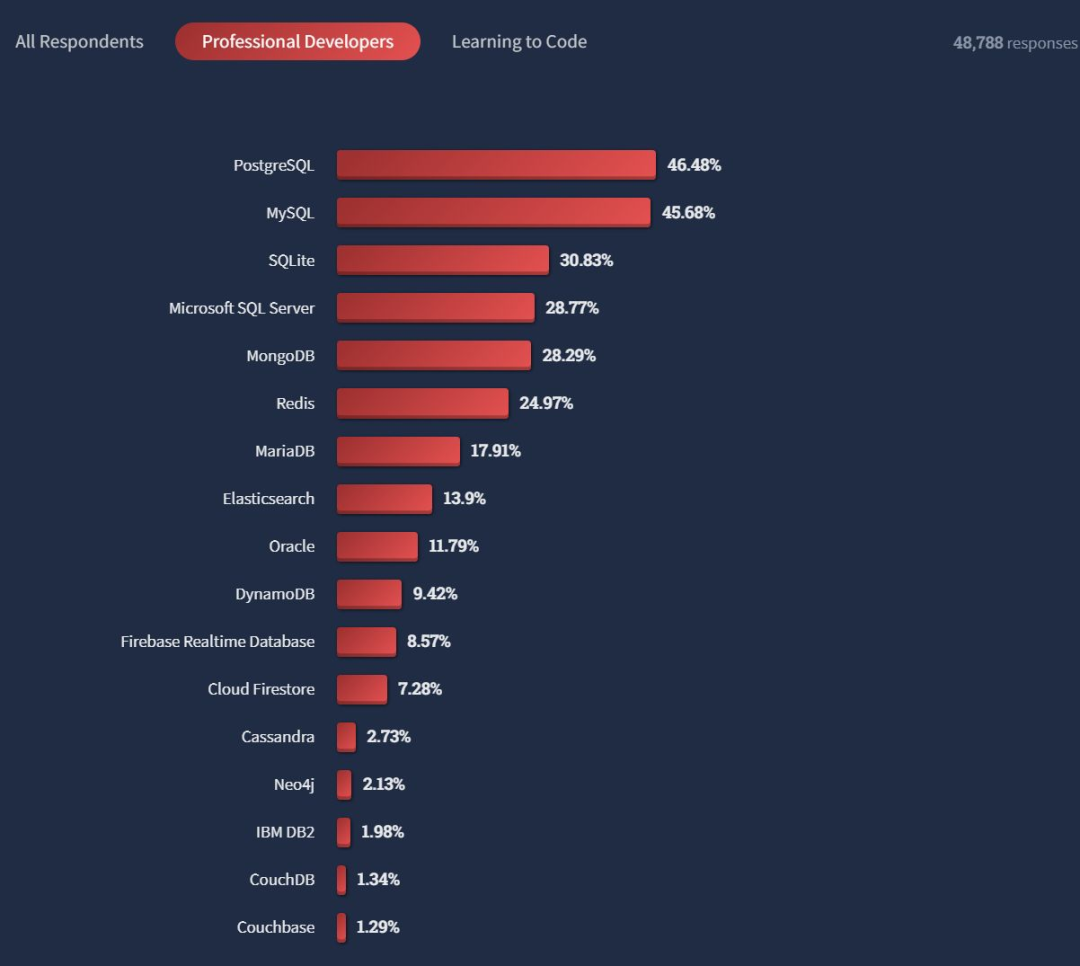PostgreSQL在这次专业开发人员调查中受喜爱程度足以说明了这点,像是国内数据库排名前三的华为OpenGuass以及平安科技的关系型数据库等也都基于PostgreSQL开发,据悉在我国的关系型数据库占比为30%左右,增长迅速。而Navicat 在市场上的流行度也不用过多介绍,在国内的市场占有率高达50% 左右。