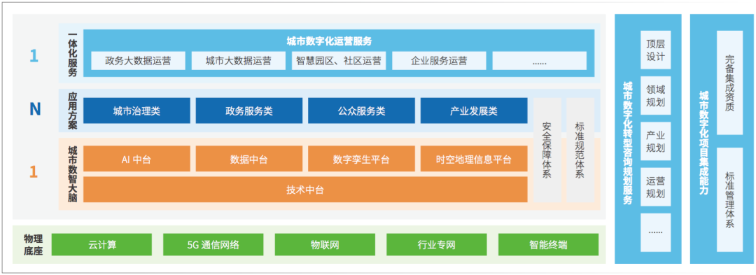 白皮书提出“以数据融通为基础、从应用场景切入、聚焦价值转化”的数字化运营创新模式。同时,基于亚信科技在咨询规划、产品研发、系统集成、数据运营等方面的能力以及丰富的业务实践,构建“1+N+1”(1个城市数智大脑+N个场景化应用+1套咨询规划、建设集成和运营运维专业服务)的城市数字化运营能力框架,力求更有实效地帮助城市管理者开展价值运营,推进城市转型。