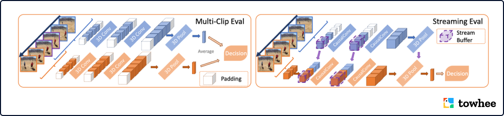 MoViNets¹ 是一个卷积神经网络系列,对 2D 视频分类器和 3D 视频分类器取长补短,兼容它们的关键优势,并减轻各自的局限性。该系列模型通过神经结构搜索获得丰富的高效视频网络结构,引用流缓冲技术使得3D卷积能够接受任意长度的流视频序列,再简单地集成多个模型用于提高精度,最终有效地平衡计算量、内存开销、精度。
