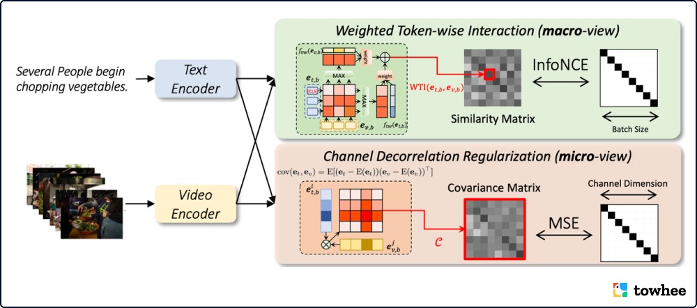 CLIP4Clip 在计算文本和视频的相似度时,只考虑了两个模态的总体表征,缺少细粒度的交互。比如,当文字描述只对应了视频的一部分帧时,如果抽取视频的整体特征,那么模型可能会被其它视频帧的信息干扰与误导。DRL对 CLIP4Clip 提出两个重要改进,一个是 Weighted Token-wise Interaction,进行相似度的稠密预测,通过 max 操作找到潜在的激活的 token。另一个是Channel Decorrelation Regularization,通道去相关正则可以减少通道间信息的冗余和竞争,使用协方差矩阵度量通道上的冗余。