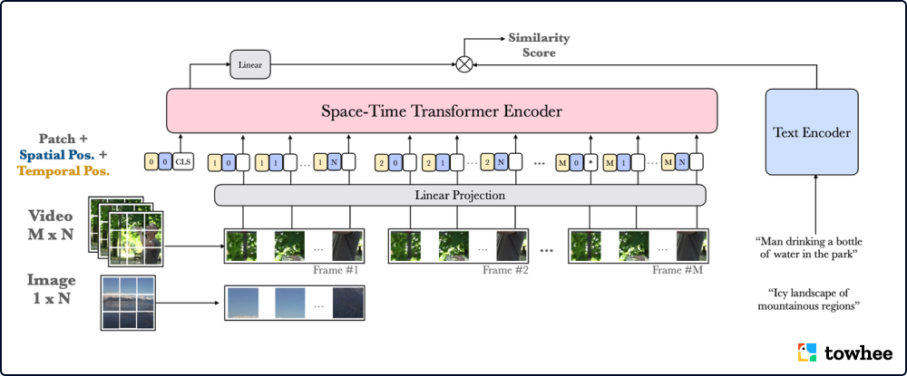 牛津大学在 ICCV2021 发表了 Frozen in Time⁴,灵活地利用文本/图像和文本/视频数据集,提供了端到端的视频图像联合编码器。该模型是对最近的 ViT 和 Timesformer 结构的修改和扩展,并且包括在空间和时间上的注意力。