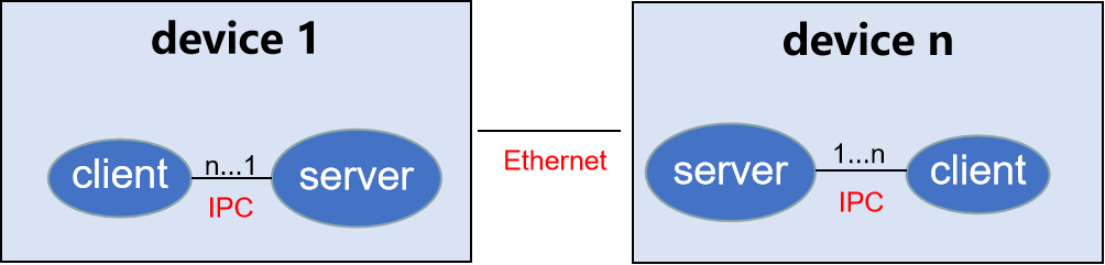 软总线支持局域网内多设备部署,设备间通过以太网通信。单设备上分为server和client,二者通过IPC模块进行交互。