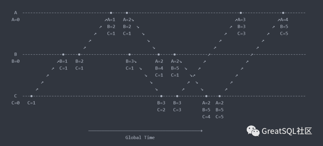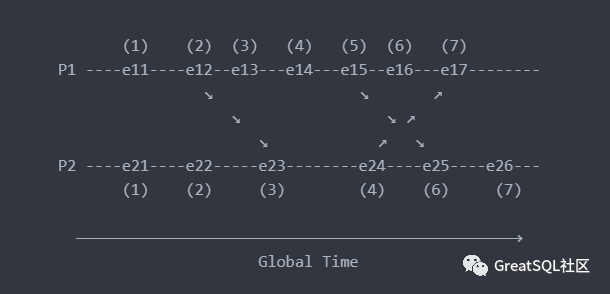 从上面的介绍中可以发现,逻辑时钟是一个正确的算法。MySQL的用户可能觉得逻辑时钟很熟悉,在MySQL的组提交中正是应用了逻辑时钟的方式来解决 binlog 在副本上进行重放时的并发问题。逻辑时钟可以解决事件的偏序问题,但在事件全序上则无法保证。即能够保证存在因果关系的事件的时序,但在不同的节点上不存在因果关系的事件却不符合事件真正发生的顺序。这是因为事件只有在发生因果关系(存在依赖关系)时才会向其他进程发送事件,不存在因果关系的事件之间不存在交互,也就无从知道它们事件的时序。虽然我们从上帝视角可以知道他们的时序,但进程视角的狭隘限制了它。