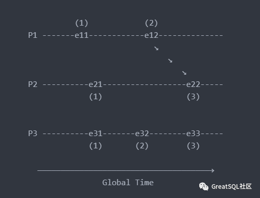 对于进程 i 来说,Ti[i] 是进程 i 本地的逻辑时间 当进程 i 有新的事件发生时,Ti[i] = Ti[i] + 1 当进程 i 发送消息时将它的向量时间戳(MT=Ti)附带在消息中。 接受消息的进程 j 更新本地的向量时间戳:TJ[k] = max(Tj[k], MT[k]), for k = 1 to N。(MT即消息中附带的向量时间戳)