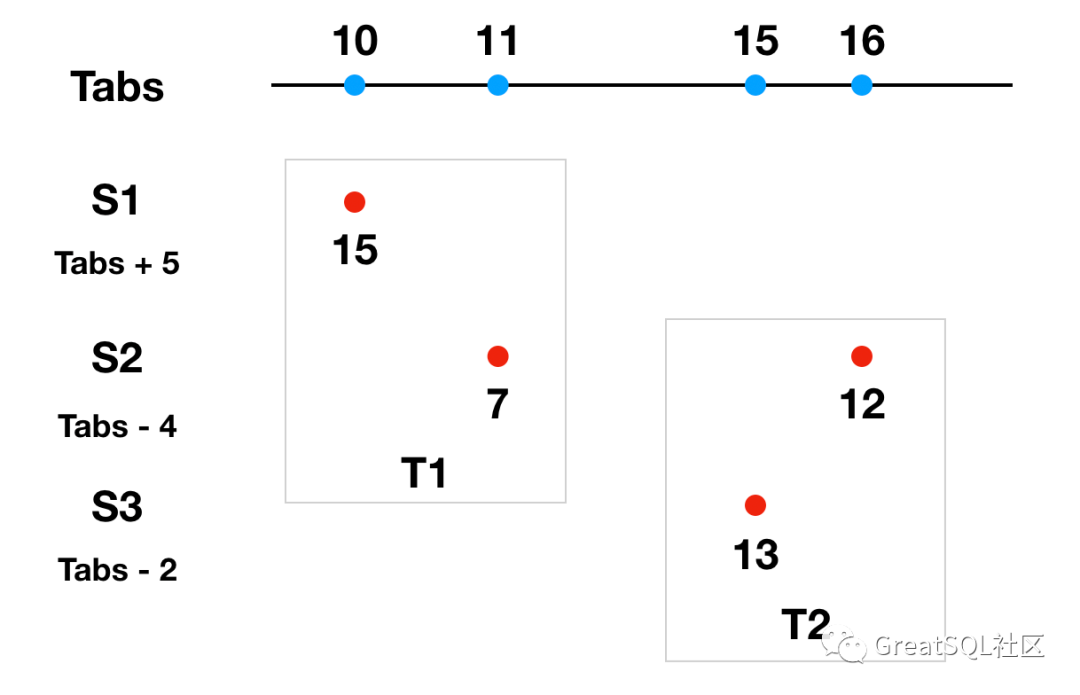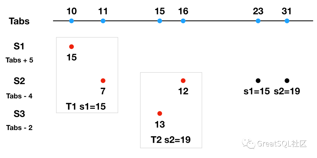 S2 作为协调者发起分布式事务T1,参与者 S1、S2,S1 执行 T1 本地分支事务时间为 15ms (此时 Tabs 为 10ms), S2 执行 T1 本地分支事务的本地时间是 7ms(此时 Tabs 为 11ms),S2作为协调者需要选择参与者中时间最大成员时间作为提交时间,所以选择S1的 15ms 作为提交时间。