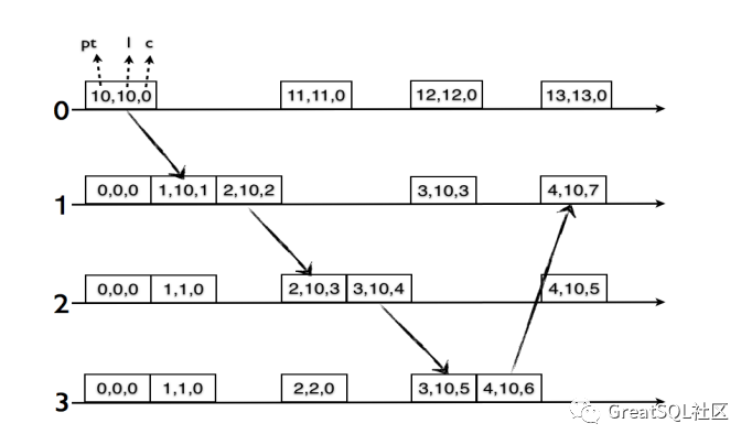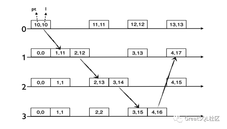 在上图中,当继续在1,2,3节点间的循环,可以看到在节点1上 pt 在追赶并超过 l.j = 10 ,并且重置了逻辑时钟部分 c.j = 0。后续节点间传递消息时,因为节点的 pt 较小,可以看出一直在追赶 HLC 的物理时钟,并且在 HLC 物理始时钟相等时,仅仅增加逻辑时钟部分,直到节点 1,2,3 中任何一个的本地物理时钟值超过 10,这时会将 c.j 重置为 0。
