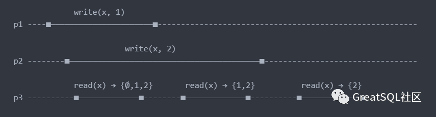 如下图所示,write(x, 1)表示设置寄存器x=1,寄存器初始值为Ø(表示为空集)。read(x)表示读取寄存器x值,这里隐含着三个线程使用了相同的时钟,横向即为时钟演进方向。线段长短代表指令执行时长。