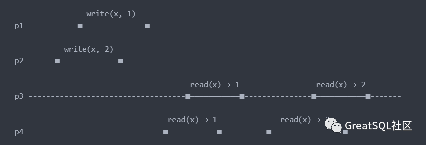 在上图中,进程p1和p2进行了无因果顺序的写入,他们的写入无序的传播到其他进程,进程p3先看值1,在看到值2,而进程p4,却首先看到值2,再看到值1。进程p3与进程p4看到的时间顺序并不一致,如果两个写入操作没有依赖关系,那么这种病情况并无大碍,如果存在依赖关系,操作无序的传播就会引起一致性的问题。