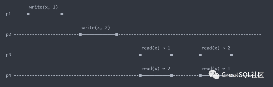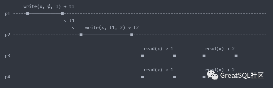 p1: write(x, 1) -> p3: (read(x) → 1) -> p4: (read(x) → 1) -> p2: write(x, 2) -> p3: (read(x) → 2) -> p4: (read(x) → 2)