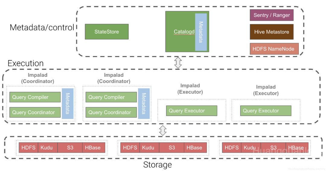 Impala集群包含一个Catalog Server (Catalogd)、一个Statestore Server (Statestored) 和若干个Impala Daemon (Impalad)。Catalogd主要负责元数据的获取和DDL的执行,Statestored主要负责消息/元数据的广播,Impalad主要负责查询的接收和执行。