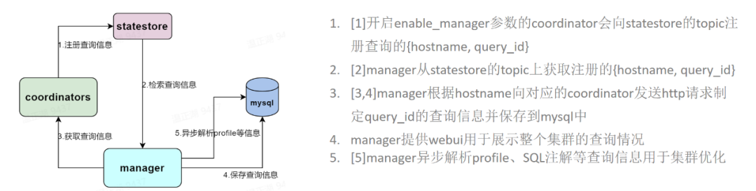 Impala进行准入控制的载体是coordinator节点,由于一个集群至少有2个及以上的coordinator节点,但准入控制是针对整个集群的。Impala通过statestore的impala-request-queue topic机制在coordinator间周期性地同步每个coordinator上的查询并发和内存使用情况。