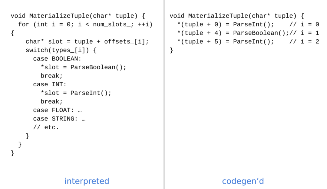 左侧是通用的从文件读取记录(tuple)并解析的行数,外层一个for循环用于对每一列进行处理,内层的switch用于判断列的类型并调用特定的解析函数。如果我们已经知道该记录由三列组成,类型分别为int,bool和int,那么JIT技术就可以生成如图右侧的函数版本,不需要for循环,也不需要switch判断,显然,执行效率更高。