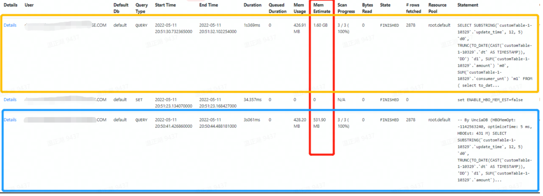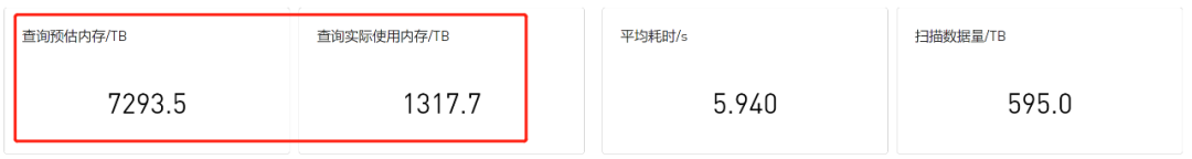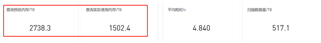此外,由于BI报表的SQL都来源于事先创建的数据模型,可以预先计算数据模型SQL的内存消耗,在执行该模型对应的报表SQL时,模型部分的内存消耗无需再次计算,直接代入即可。基于此,我们完成了方案设计和功能实现,下图为一个查询开启HBO优化前后的内存估算值变化