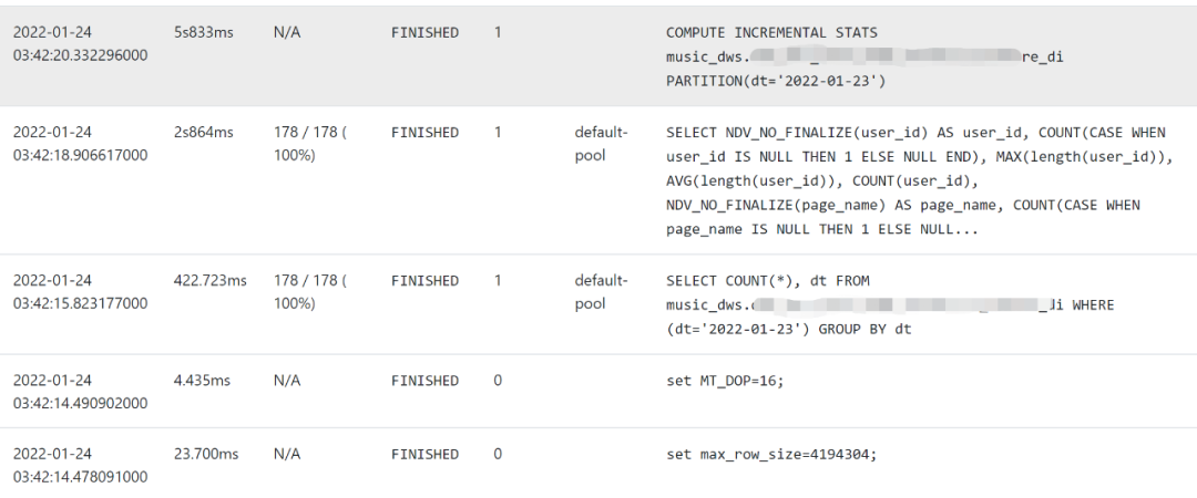 如果SQL中的表缺失了统计信息,如查询所涉及的记录数,所涉及的各列的大小等,则无法准确预估该SQL的内存消耗,导致准入控制模块出现误判,生产环境中常会出现因executor节点可用内存不足导致查询排队的情况,但其实此时内存是够的,这里有多方面的原因,比如该查询SQL所需内存预估值过大,或已经在执行的查询的配额过大等。相反的,如果预估所需内存过小,则可能导致查询在执行过程中因为executor节点无法分配所需内存而导致SQL执行失败。
