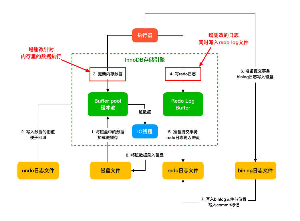 当执行某个写操作的 SQL 时,引擎将这行数据更新到内存的同时把对应的操作记录到 redo log 里面,然后处于 prepare 状态。并把完成信息告知给执行器。