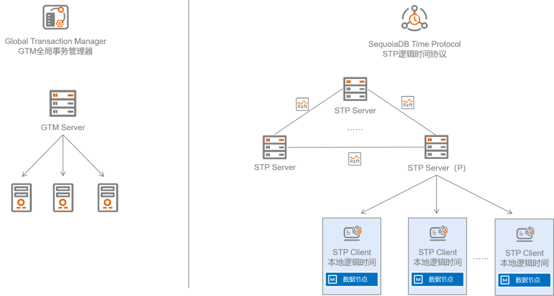 SequoiaDB 巨杉数据库基于获得专利的全分布式逻辑时钟机制,构建“STP序列时钟协议”。各STP Server之间通过Raft保证逻辑时钟的强一致性,每个数据库节点通过本地的STP Client与主STP Server保持逻辑时钟一致性。通过专利STP技术确保逻辑时钟持续向前推进,防止出现冲突,使得各数据库节点进行分布式事务处理时,只需要通过本地获取时钟即可,避免了强制所有参与节点从GTM中获取唯一ID的步骤,大大降低延迟。当前,基于这一技术巨杉数据库已经可以支持超过4096节点,数十PB级别的海量数据扩展。
