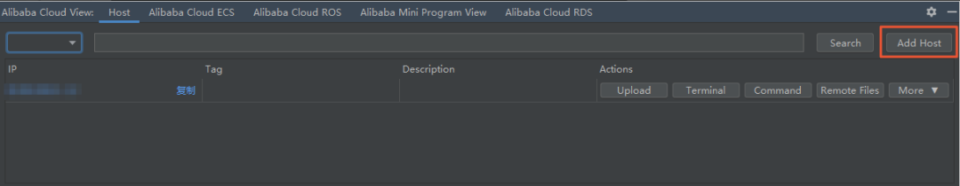 在IntelliJ IDEA顶部菜单栏中选择Tools>Alibaba Cloud>Alibaba Cloud View>Host。