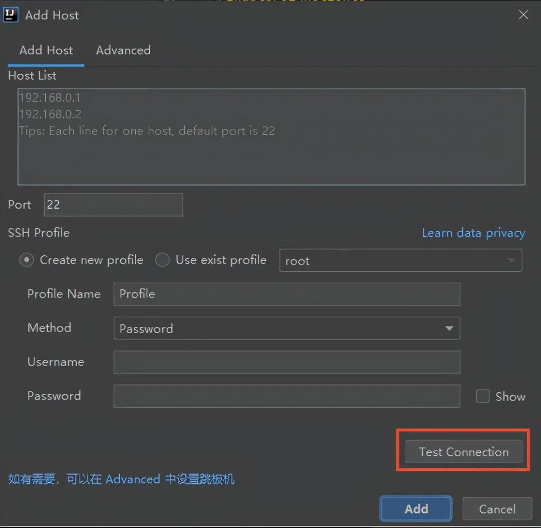 3.在Add Host对话框中设置Host List、Username、Password和Tag等参数,完成后单击 Add。