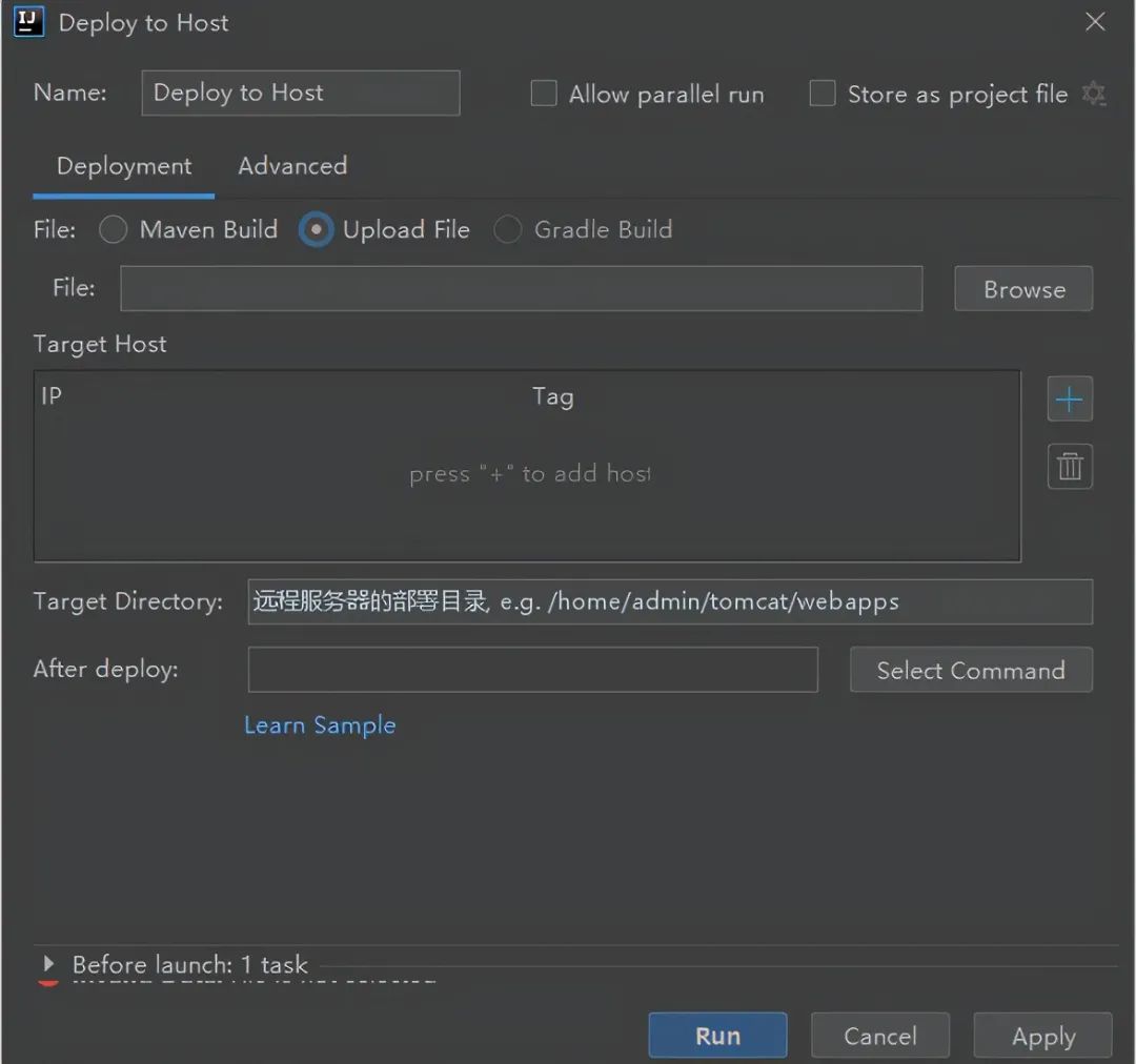 Upload File:若当前工程不是采用Maven构建,或在本地已存在打包好的部署文件,可以选择并上传本地的部署文件。