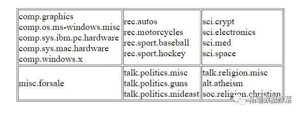 出于演示目的,我们将使用 20个新闻组 数据集。数据分为20个类别,我们的工作是预测这些类别。如下所示: