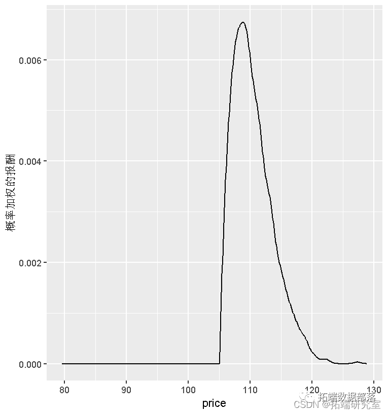从那里,估计被模拟股票期权的 概率加权收益曲线 ,比如一个 看涨期权 在 105 处执行(同样,考虑到我们的模型假设,并忽略远期利率和股息):