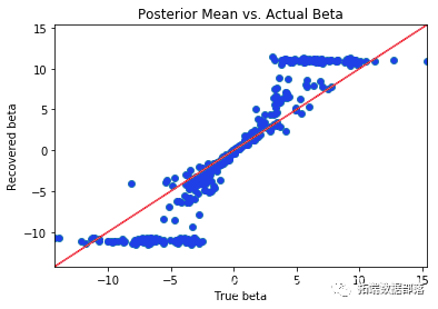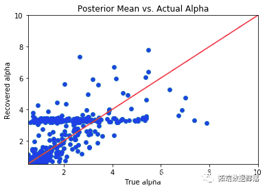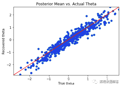 从后验分布采样后,我检查参数的后验均值。如果模型在恢复参数方面做得很好,则参数的后验均值与实际参数值的散点图应以恒等线为中心。