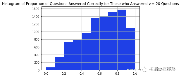 在我淘汰回答少于 20 个问题的学生之前,我会检查那些回答较少问题的学生是否比那些回答较多问题的学生弱。我可以通过比较 2 个不同人群正确回答的问题比例分布来粗略检查这一点。从下面的直方图中,直方图的形状似乎相同,因此我们可以继续过滤掉回答少于 20 个问题的学生。