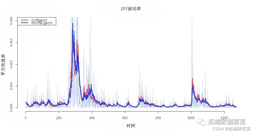 我从谷歌提取数据,采集5年的标准普尔指数收益序列,并估计标准 garch(1,1) 和另一个更准确的 GJR-garch(不对称 garch)。
