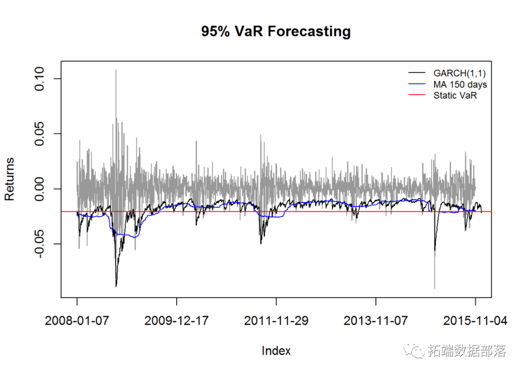 从图中我们可以看到,VaR-GARCH(黑线)组合更加符合实际,降低了发生波动时的VAR限制,而对于静态VaR(红线),我们观察到了收益率连续突破界限。