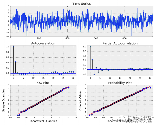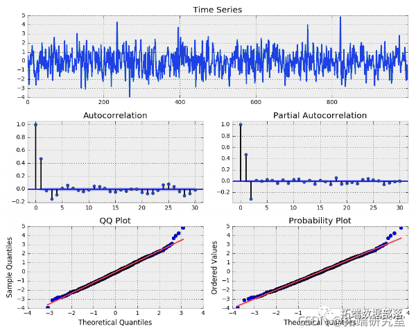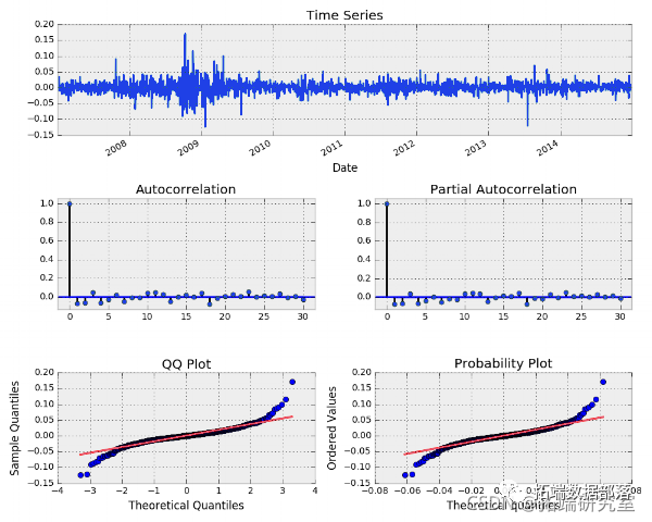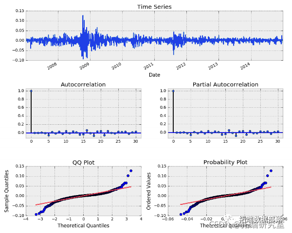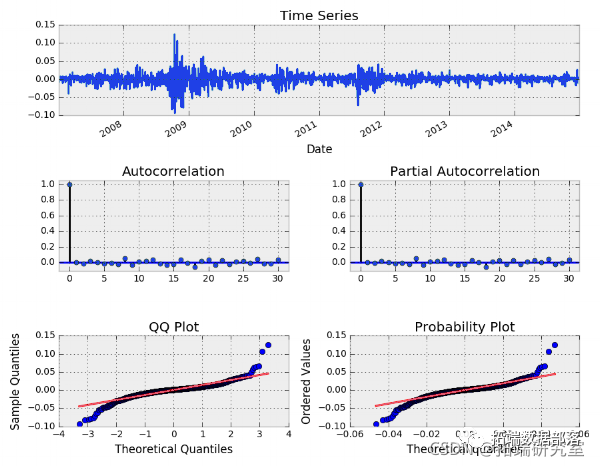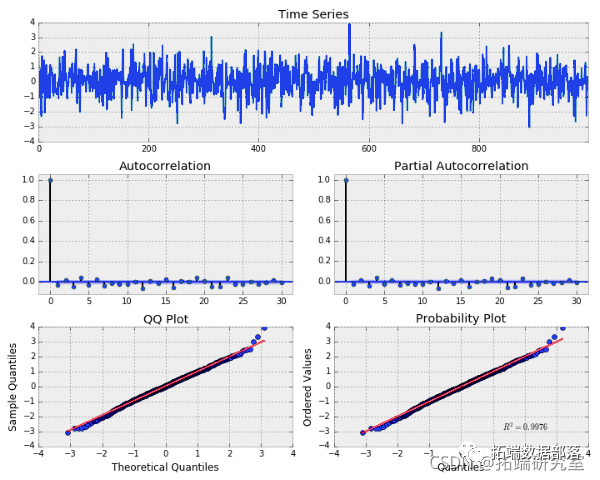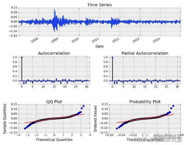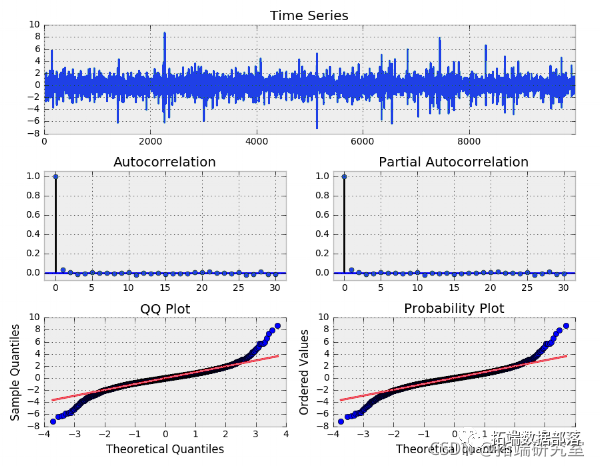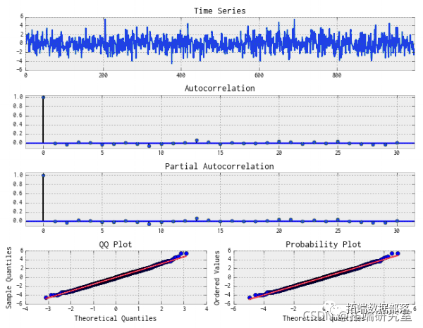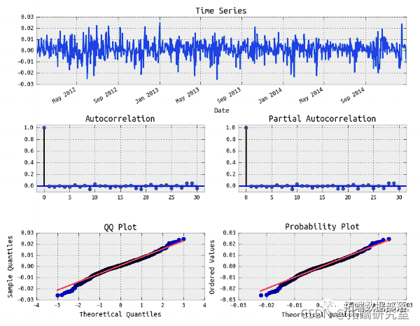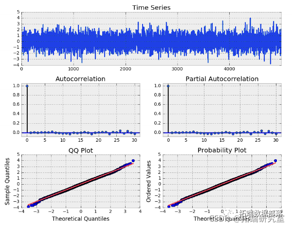 我们可以看到该过程似乎是随机的并且以零为中心。自相关 (ACF) 和偏自相关 (PACF) 图也表明没有显着的序列相关。请记住,我们应该在自相关图中看到大约 5% 的显着性,这是由于从正态分布采样的纯偶然性。下面我们可以看到 QQ 和概率图,它们将我们的数据分布与另一个理论分布进行了比较。在这种情况下,该理论分布是标准正态分布。显然,我们的数据是随机分布的,并且应该遵循高斯(正常)白噪声。