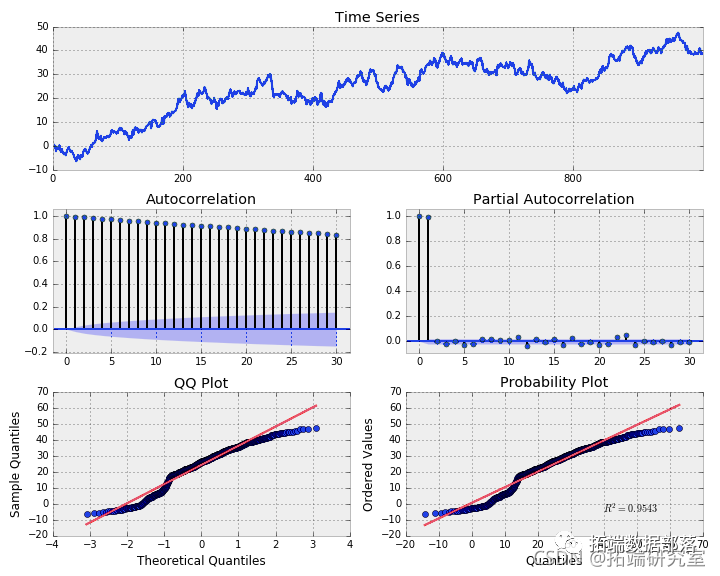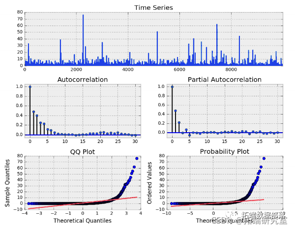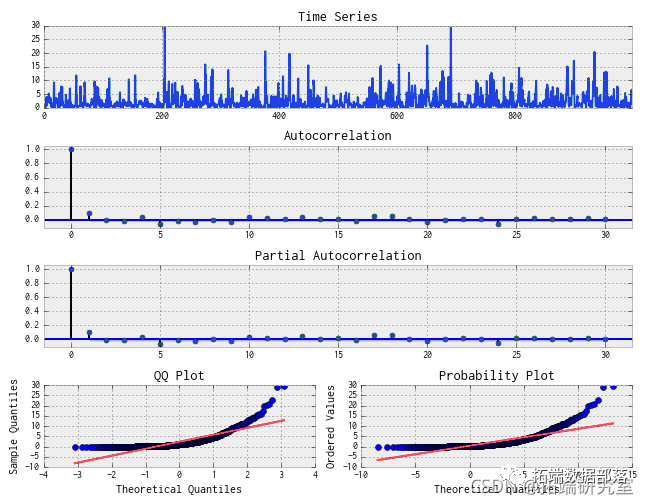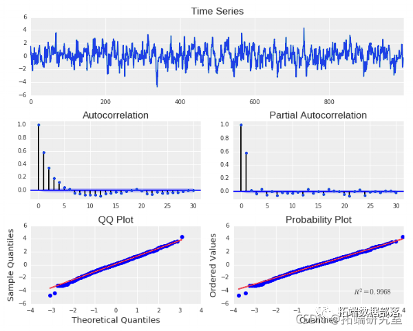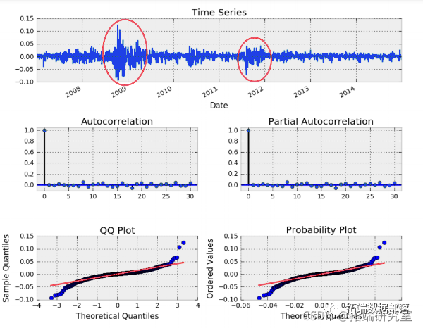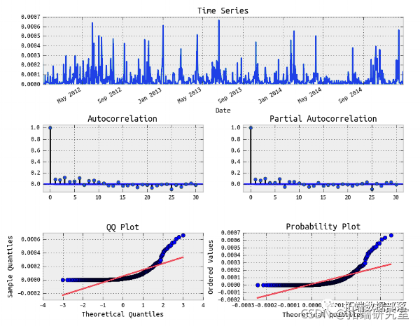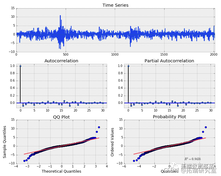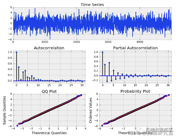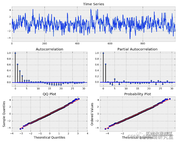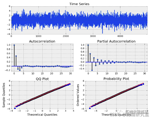 我们可以看到该过程似乎是随机的并且以零为中心。自相关 (ACF) 和偏自相关 (PACF) 图也表明没有显着的序列相关。请记住,我们应该在自相关图中看到大约 5% 的显着性,这是由于从正态分布采样的纯偶然性。下面我们可以看到 QQ 和概率图,它们将我们的数据分布与另一个理论分布进行了比较。在这种情况下,该理论分布是标准正态分布。显然,我们的数据是随机分布的,并且应该遵循高斯(正常)白噪声。