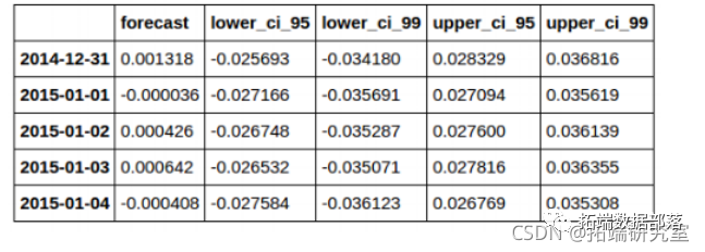 现在我们至少积累了足够的知识来对未来的收益进行简单的预测。这里我们使用我们模型的predict() 方法。作为参数,要预测的时间步数需要一个整数,alpha 参数需要一个小数来指定置信区间。默认设置为 95% 置信度。对于 99%,设置 alpha 等于 0.01。