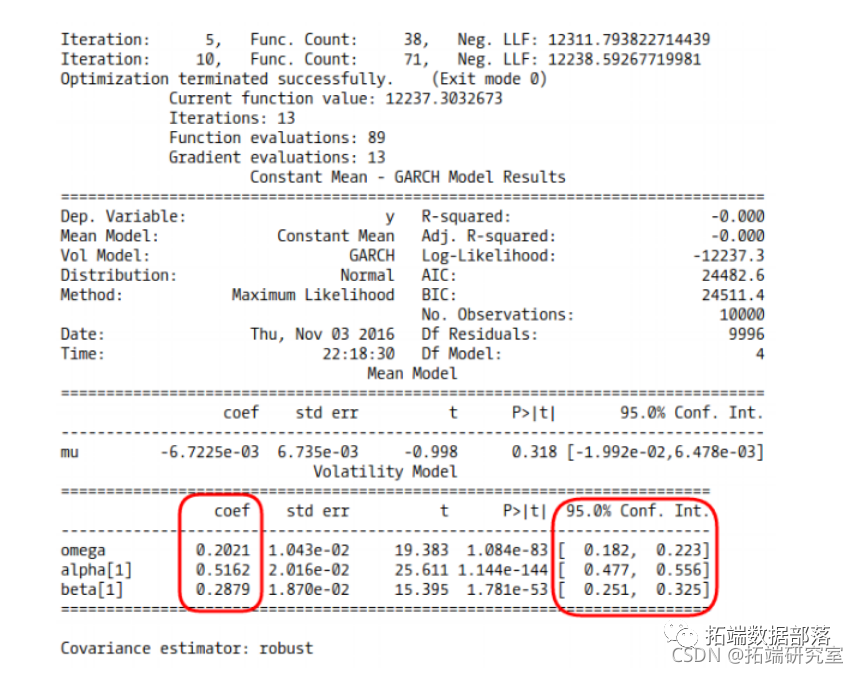 显然存在着自相关,ACF和PACF的滞后期的重要性表明我们的模型需要AR和MA。让我们看看我们是否能用GARCH(1, 1)模型恢复我们的过程参数。这里我们使用ARCH包中的arch_model函数。