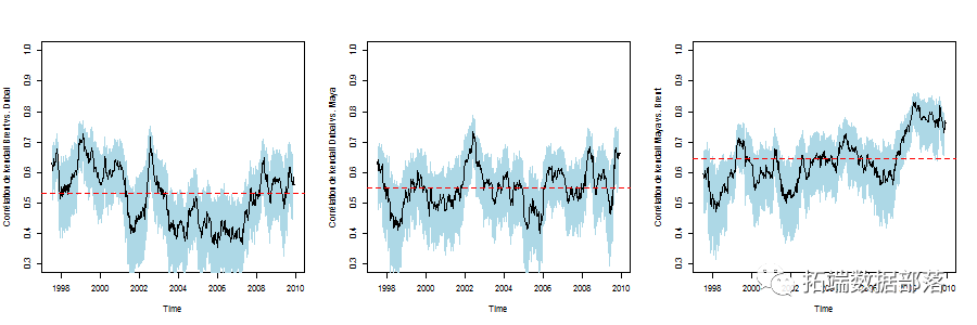 所有3个GARCH 模型的输出 都以表格格式显示。Ω (ω) 是白噪声,alpha和beta是模型的参数。此外, α[1] +β[1] <1 表示稳定的模型。 EGARCH 似乎是最好的三个这模型。
