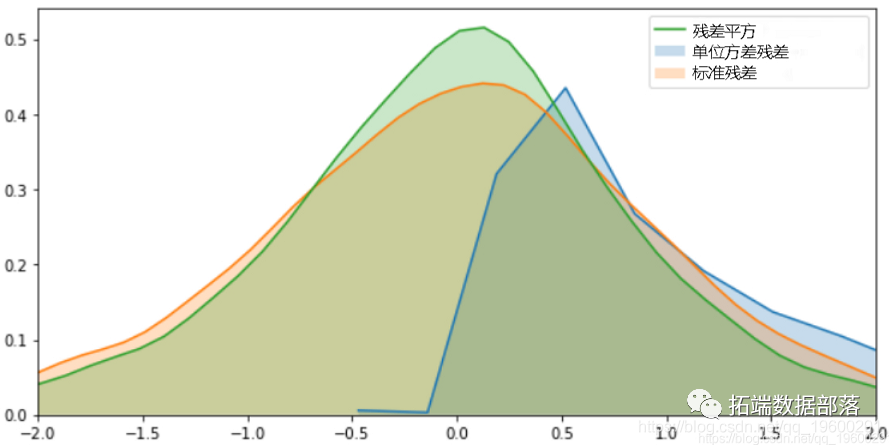 残差平方显示数据点在蓝色阴影的置信度区域(95%)内,表示模型拟合较好。