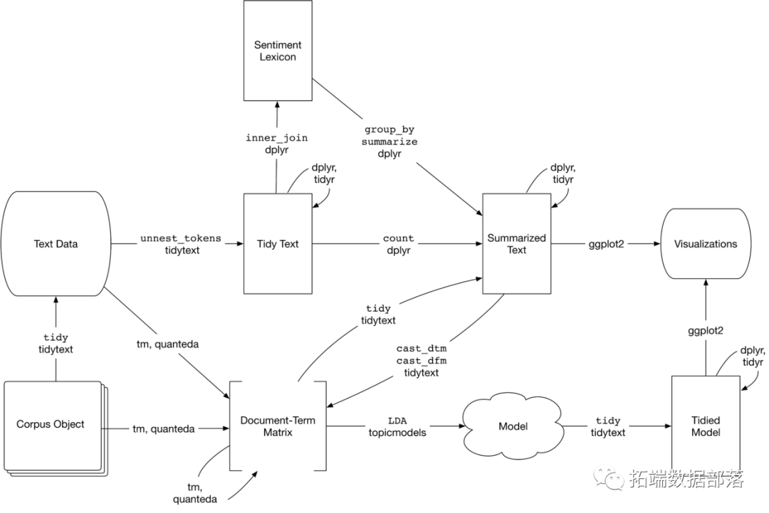 结合主题建模的文本分析流程图。topicmodels包采用Document-Term Matrix作为输入,并生成一个可以通过tidytext进行处理的模型,以便可以使用dplyr和ggplot2对其进行处理和可视化。