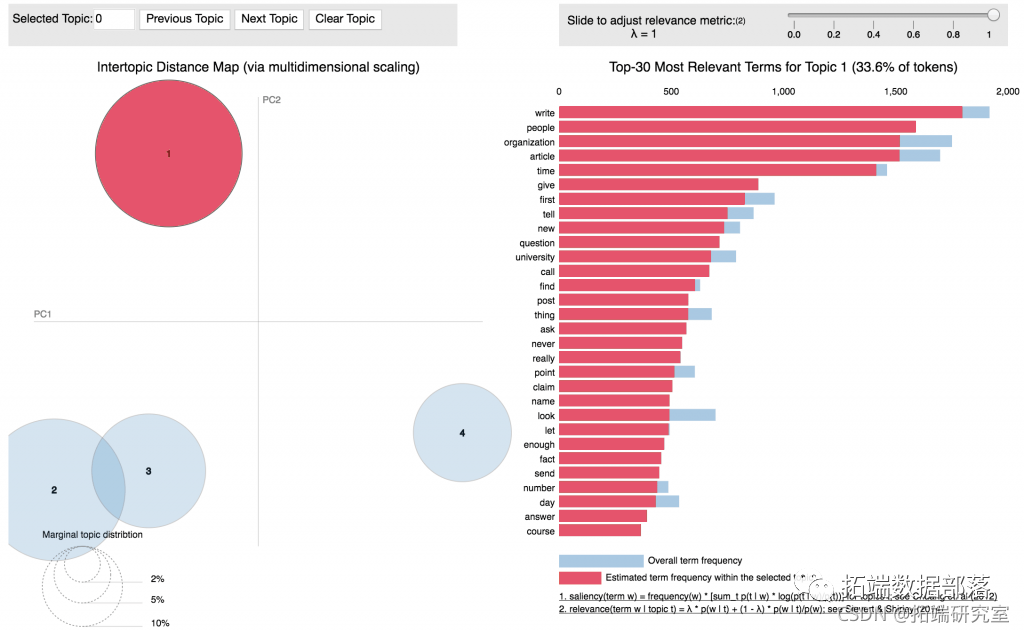 实际上几乎所有的主题模型都会使用更大的模型k,但我们很快就会看到,这种分析方法可以扩展到更多的主题。