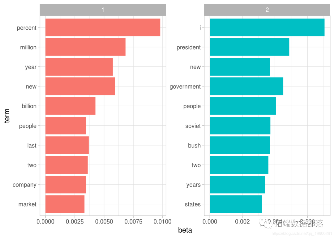 tidytext包提供了这种方法来提取每个主题的每个词的概率,称为β。