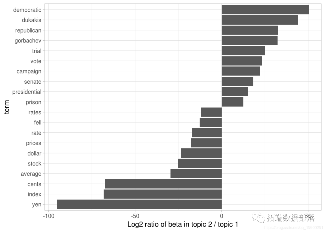 我们可以认为_最大的区别_是两个主题之间β差异最大的词。